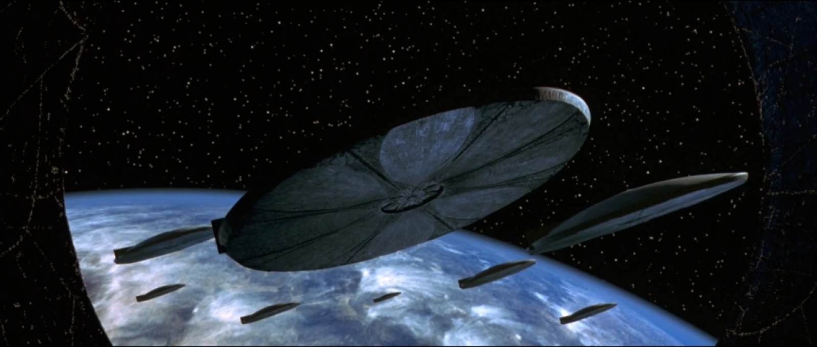 The shadows of the Destroyers passing over the cities and monuments were achieved both by digital manipulation of wide location shots and by simply moving large cutouts over miniature monuments shot outdoors in daylight.[8]