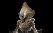 The Harvesters/aliens were created by production designer Patrick Tatopoulos. Initially, Tatopoulos came up with two different designs for the aliens, one that was more fearsome looking and large, and another that was smaller and more frail; closer to a traditional alien design. Tatopoulos asked Roland Emmerich to pick which one he liked better. Emmerich liked both so much that he decided to use the first design as their protective bio-suits and the second design for the actual aliens themselves.[4] This would provide the audience with a deception and surprise them when the actual appearance of the frail and tiny alien was revealed. It would also show that looks could be deceiving, as the aliens are far deadlier than they appear to be.[5] Emmerich and Dean Devlin wrote the aliens to have a "grand entrance" invasion similar to the premise of The War of the Worlds after noticing too many alien invasion films which depicts small towns being invaded or humans being secretly controlled by alien spores/parasites.[6]