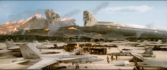 All remaining military forces on Earth were informed of the July 4th counteroffensive via Morse code from the Americans, with Whitmore himself personally leading the first strike to confirm the shields are disabled. After Levinson successfully transmitted the virus, Whitmore led his forces in battling a City Destroyer approaching Area 51 and were able to inflict damage on the invaders. It is during this battle that the Americans learned that the destroyer's weapon port is its weak point, when one pilot, Russell Casse, flew his aircraft directly into the weapon port in a suicide attack, causing a explosive chain reaction that completely destroys the entire ship.